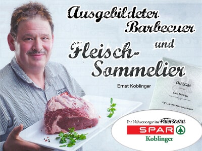 Ich bin der erste Fleischsommelier in Tirol und das schmeckt man auch! Unsere Fleisch- und Wurstwaren im Spar Markt Koblinger in St. Ulrich am Pillersee sind sorgfälltig ausgewählt für besten Genuss.